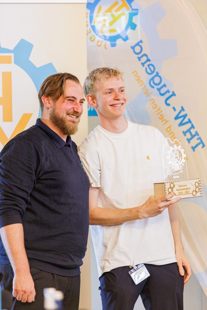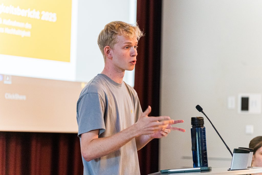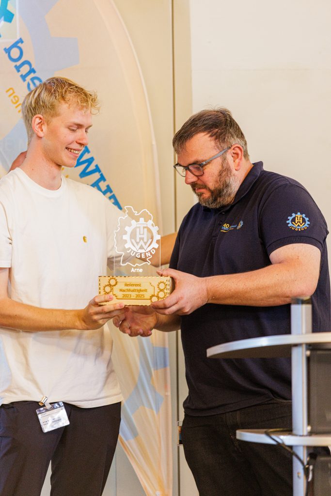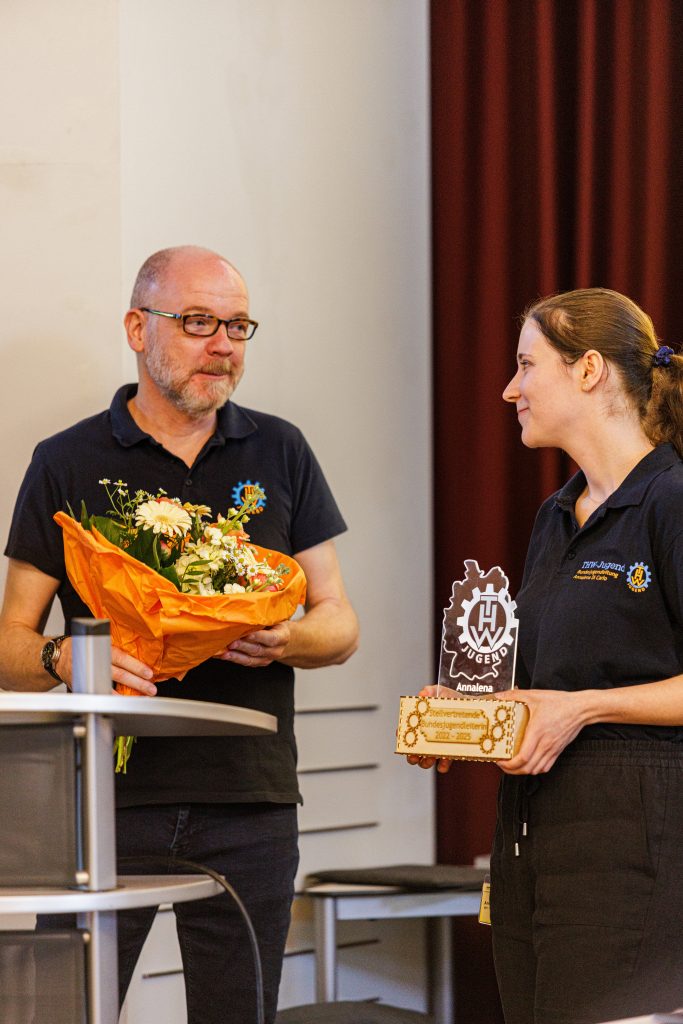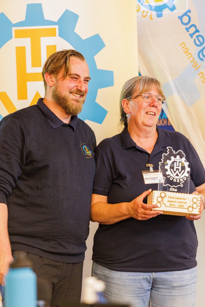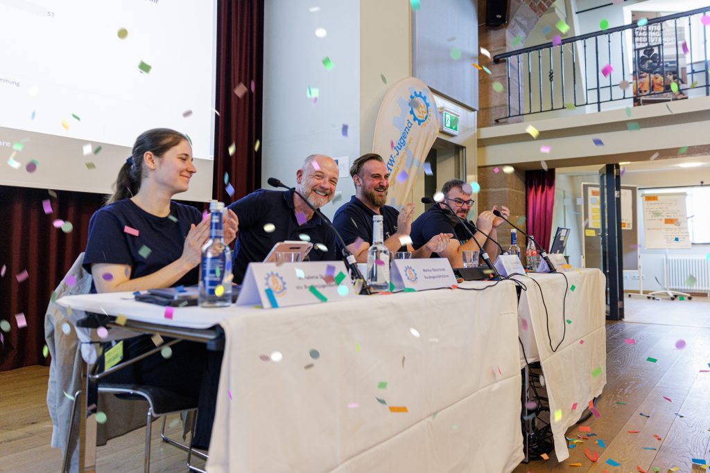 Natürlich gab es auch emotionale Momente. Einige langjährige Engagierte verabschiedeten sich aus ihren Ämtern: Annalena Di Carlo, bisher stellvertretende Bundesjugendleiterin, trat nicht erneut zur Wahl an. Auch die Referent:innen Arne Schaper (Nachhaltigkeit), Elke Schumacher (Chefredaktion Jugend-Journal), Jonas Lorenz (Veranstaltungen) und Verena Bosch (Bildungsarbeit) wurden herzlich verabschiedet. Patrick bedankte sich bei allen für ihre geleistete Arbeit und überreichte jedem von ihnen ein persönliches Andenken an die Zeit in unserem Jugendverband. Ein besonderer Moment war die Ernennung von Ingo Henke zum Ehrenbundesjugendleiter – eine Auszeichnung für sein außergewöhnliches Engagement über viele Jahre hinweg. Ein letztes Dankeschön für ihre geleistete Arbeit konnte Bundesgeschäftsführer Markus Ratschinski an Shida Hatamlooy überreichen. Als dienstälteste Mitarbeiterin der Bundesgeschäftsstelle war es für sie der letzte BJA – bald tritt sie in den wohlverdiensten Ruhestand ein. Von den Delegierten gab es dafür Standingovations.
